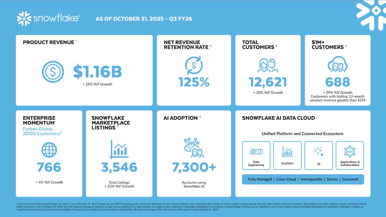 Siemensとの共同で産業AIソリューションを展開し、多クラウド対応が顧客のTCO(総所有コスト)を20%低減。Q3に50以上の新機能リリースで、データ共有「Snowflake Marketplace」のアクティブユーザーも急増。